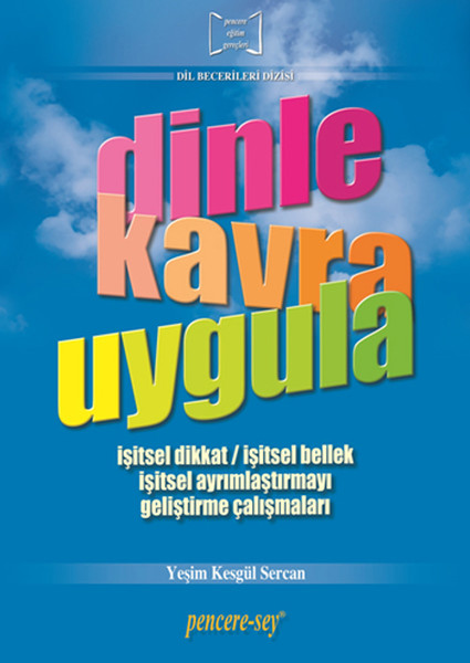 "dinle kavra uygula" Dil Becerileri Dizisi'nin üçüncü kitabıdır, işitsel sözel becerileri geliştirmek amacıyla hazırlanmış bir rehber kitaptır.