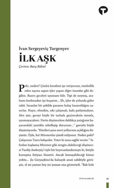 19. yüzyıl Rus edebiyatının önde gelen yazarlarından İvan Sergeyeviç Turgenyev, İlk Aşk'ta gençlik heyecanıyla dolu ilk aşkının heyecanını, tutkusunu anlatırken aynı zamanda yaşadığı hayal kırıklığını bir aile dramıyla ele alarak romantik edebiyatın etkileyici örneklerinden birini sunuyor.