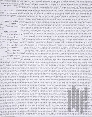 Arter Öğrenme Programı kapsamında hayata geçirilen Arter Araştırma Programı, çağdaş sanat alanında çalışan kültür üreticilerinin faaliyet alanlarına dair araştırma yöntemlerini, bakış açılarını ve ifade biçimlerini geliştirmelerine destek olmayı amaçlıyor. Süreç odaklı ve kendiliğinden örgütlenmeyi önemseyen bir yaklaşımı temel alan program, katılımcıların ve program yürütücülerinin işbirliğiyle şekillendiriliyor. Arter Araştırma Programı’nın Ekim 2020–Mayıs 2021 dönemi çalışmaları kapsamında üretilen Re: [aap_2020] başlıklı kitabın içeriğini, programa katılan Kerem Altaylar, Eylem Ejder, Nejbir Erkol, Alev Ersan, Furkan Öztekin, palimpsest (Larissa Araz ve Ekin Can Göksoy), Rojda Tuğrul ve Aslı Uludağ’ın devam eden araştırmalarıyla bağlantılı katkılarının yanı sıra program kapsamında birlikte üretilen metinler oluşturuyor. Kitapta ayrıca katılımcıların araştırmaları çerçevesinde başvurdukları temel kaynakları ve program süresince gerçekleştirilen buluşmalara ara verildiğinde dinlenen parçalardan oluşan çalma listesini bir araya getiren “Eşlikçiler” başlıklı bir bölüm de yer alıyor.