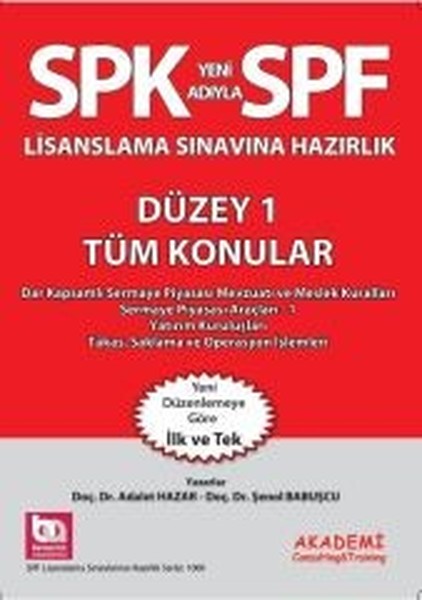 Yeni düzenleme çerçevesinde 8 farklı türde lisans belirlenmiştir. "SPF Düzey 1”kapsamında yer alan tüm konularda sınav alt konu başlıklarına göre (Sermaye Piyasası Araçları -1, Yatırım Kuruluşları, Takas, Saklama ve Operasyon İşlemleri, Dar Kapsamlı Sermaye Piyasası Mevzuatı ve Meslek Kuralları) düzenlenen bu kitapta, konu anlatımı, örnek soru çözümleri ve deneme sınavı yer almaktadır.