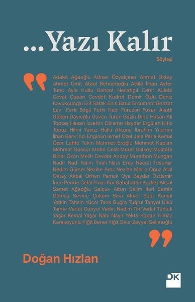 ...Yazı Kalır, Doğan Hızlan ile “yol arkadaşlığı” yapan, Türk edebiyatında iz bırakmış isimlerin kitabı. Edebiyatımızın uğradığı durakların, edebi akımların, eleştirilerin, değişimlerin hikâyesi. Belgesel niteliğindeki kitap anılarda bir gezinti. Yazarları daha iyi tanımak, eserlerini daha iyi anlamak için bir rehber. Onların sesleri ve sözleri kaybolmasın, uçup gitmesin, hak ettiği gibi edebiyat tarihindeki yerini alsın diye...